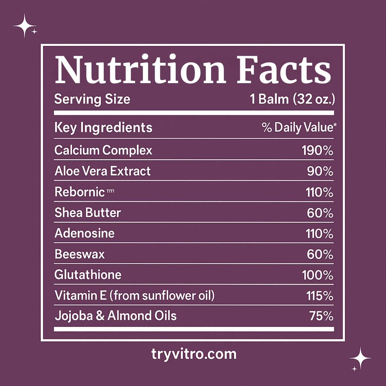 Aging skin loses Calcium, Collagen, and Elastin, causing wrinkles and sagging. Vitro’s balm restores these essentials, strengthens the barrier, improves elasticity, and deeply hydrates — leaving skin firmer, smoother, and visibly youthful.